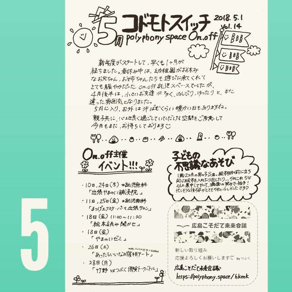 polyphony space on.off | ポリフォニースペースオンオフ | 子どもと一緒にいながら自分時間を*広島の託児付きリフレッシュ空間・コワーキングスペース・シェアスペース・レンタルスペース・一時預かり保育 | 子連れでリフレッシュ*カフェのようにくつろぐ*親子イベントも