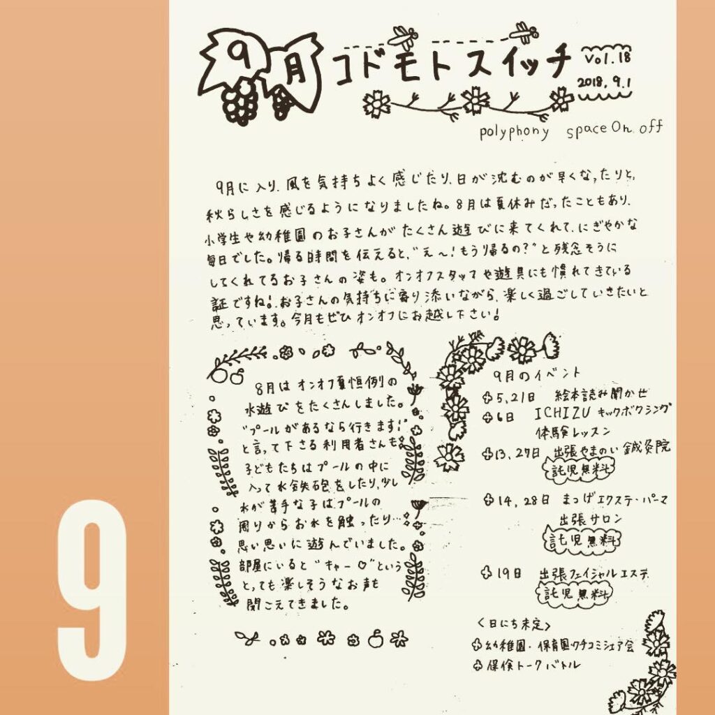 polyphony space on.off | ポリフォニースペースオンオフ | 子どもと一緒にいながら自分時間を*広島の託児付きリフレッシュ空間・コワーキングスペース・シェアスペース・レンタルスペース・一時預かり保育 | 子連れでリフレッシュ*カフェのようにくつろぐ*親子イベントも